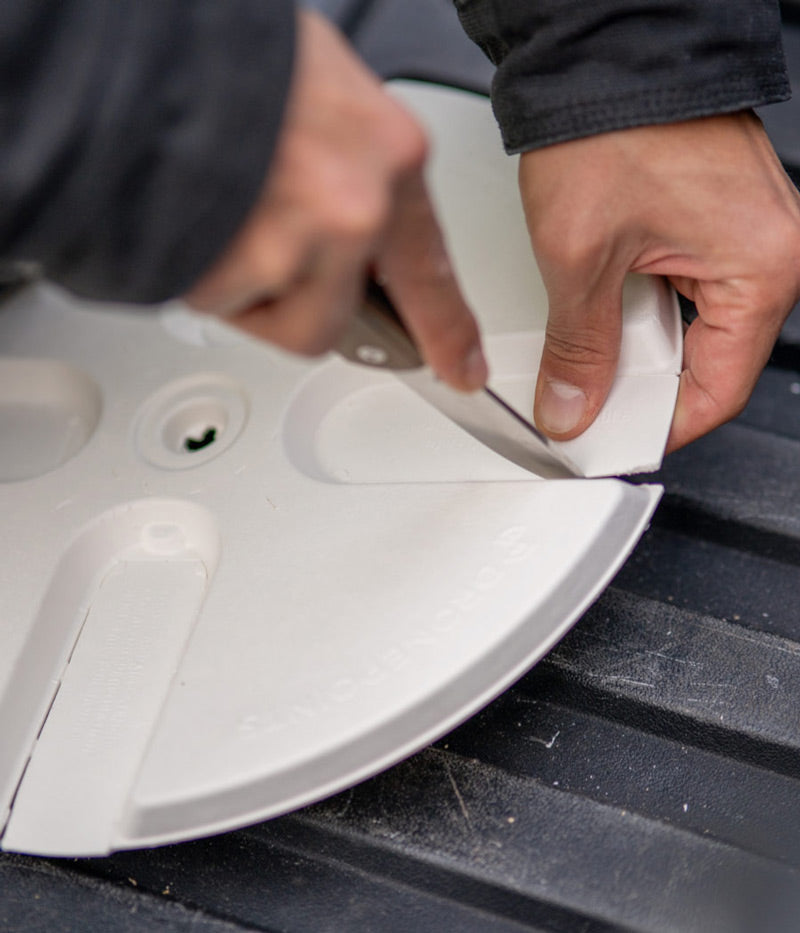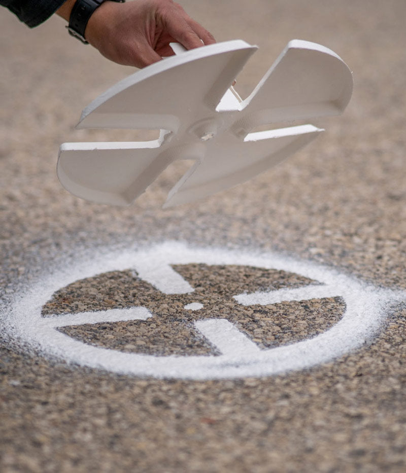 Position the Stencil: Carefully place your DronePoints stencil at the intended location. If you're aligning it over an existing survey monument or nail, utilize the center hole of the stencil for precise positioning.