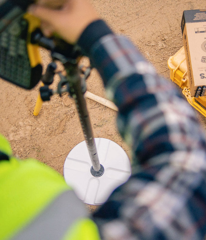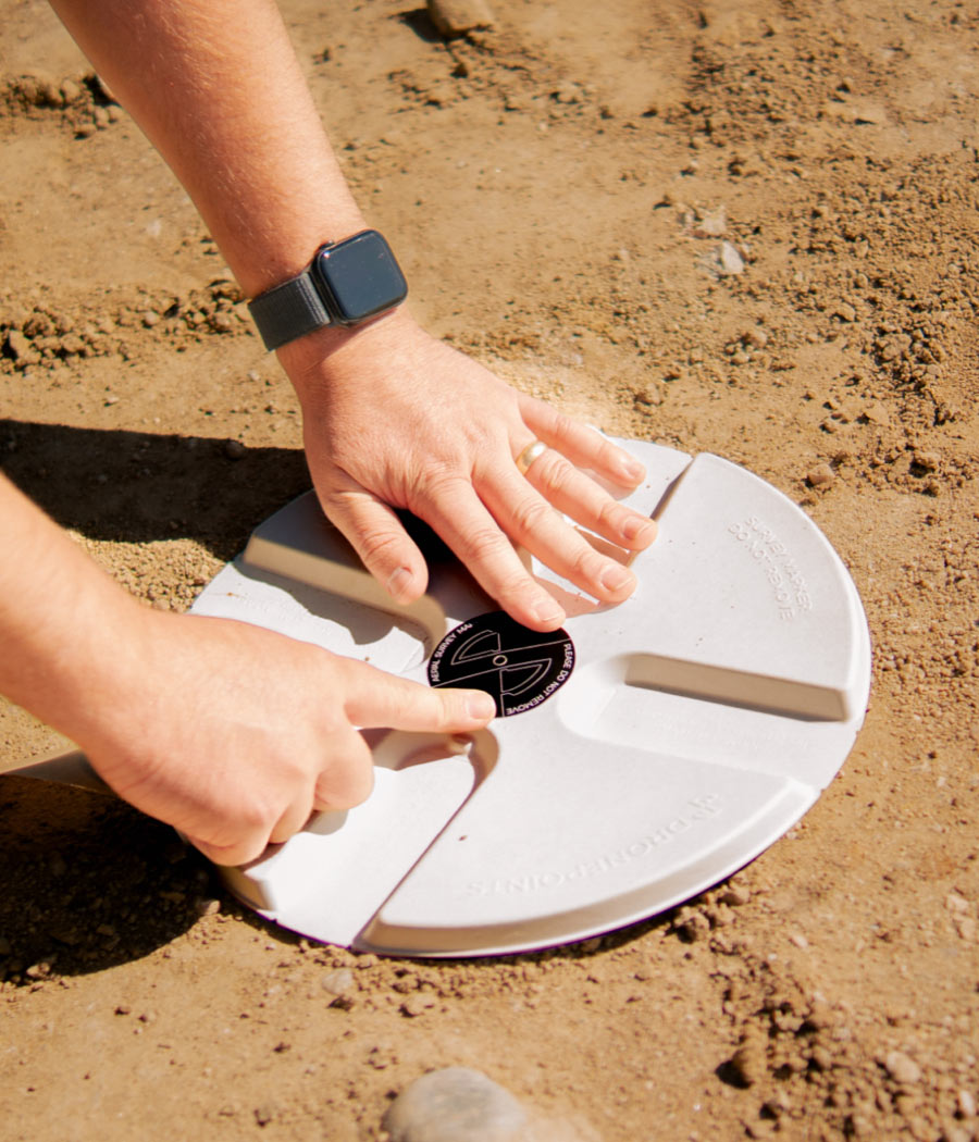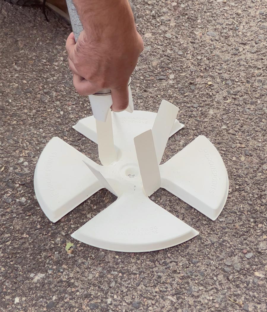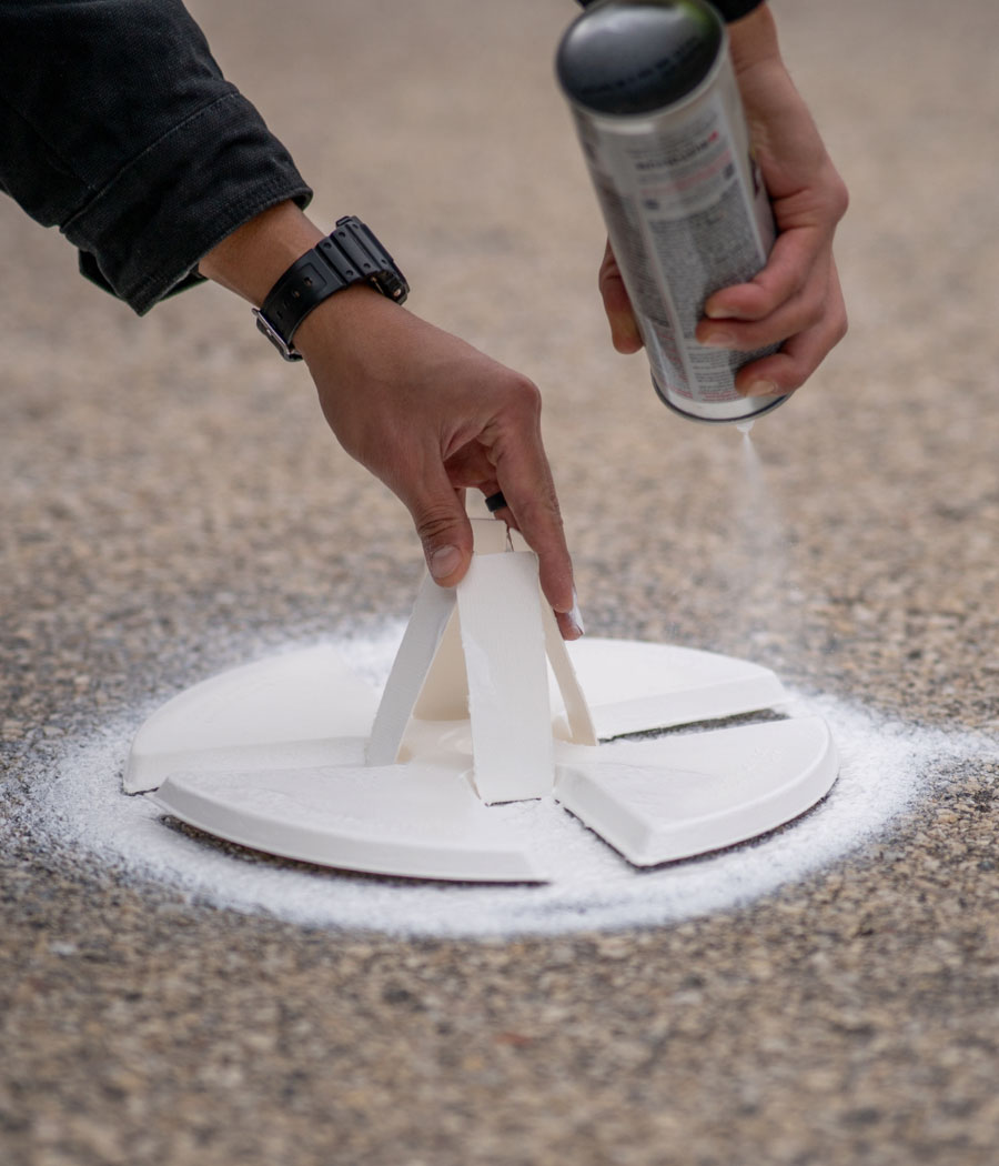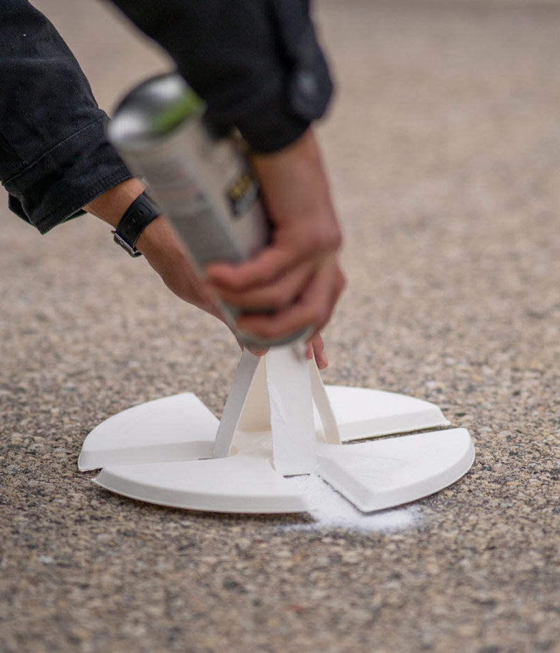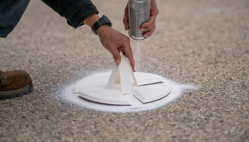 Spray the Center: With the stencil stabilized, apply your marking paint through the center hole. This mark not only guides you for any necessary realignment but also serves as a critical reference point for GPS surveys.